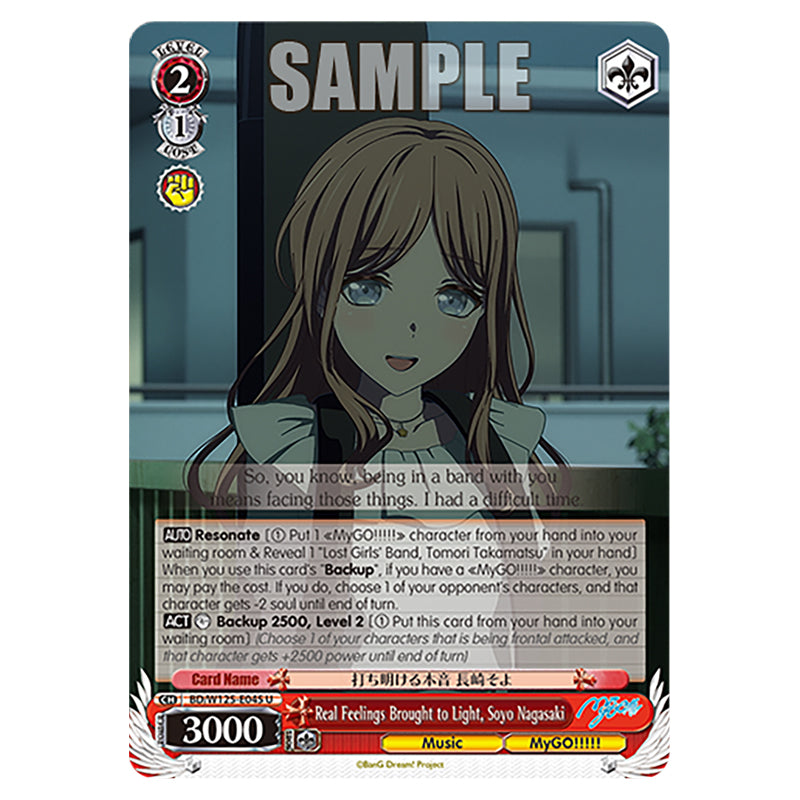 Real Feelings Brought to Light, Soyo Nagasaki is a U Red Character card from the Weiss Schwarz set MyGO!!!!! × Ave Mujica (WSSC-BD/W125-E045) 【AUTO】 Resonate [(1) Put 1 《MyGO!!!!!》 character from your hand into your waiting room & Reveal 1 "Lost Girls' Band, Tomori Takamatsu" in your hand] When you use this card's "Backup", if you have a 《MyGO!!!!!》 character, you may pay the cost. If you do, choose 1 of your opponent's characters, and that character gets -2 soul until end of turn. 【ACT】 【COUNTER】 Backup 2500, Level 2 [(1) Put this card from your hand into your waiting room] (Choose 1 of your characters that is being frontal attacked, and that character gets +2500 power until end of turn)