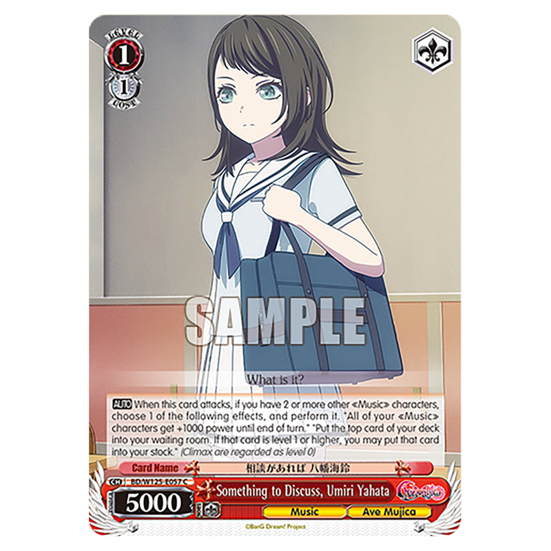 Something to Discuss, Umiri Yahata is a C Red Character card from the Weiss Schwarz set MyGO!!!!! × Ave Mujica (WSSC-BD/W125-E057) 【AUTO】 When this card attacks, if you have 2 or more other 《Music》 characters, choose 1 of the following effects, and perform it. "All of your 《Music》 characters get +1000 power until end of turn." "Put the top card of your deck into your waiting room. If that card is level 1 or higher, you may put that card into your stock." (Climax are regarded as level 0)