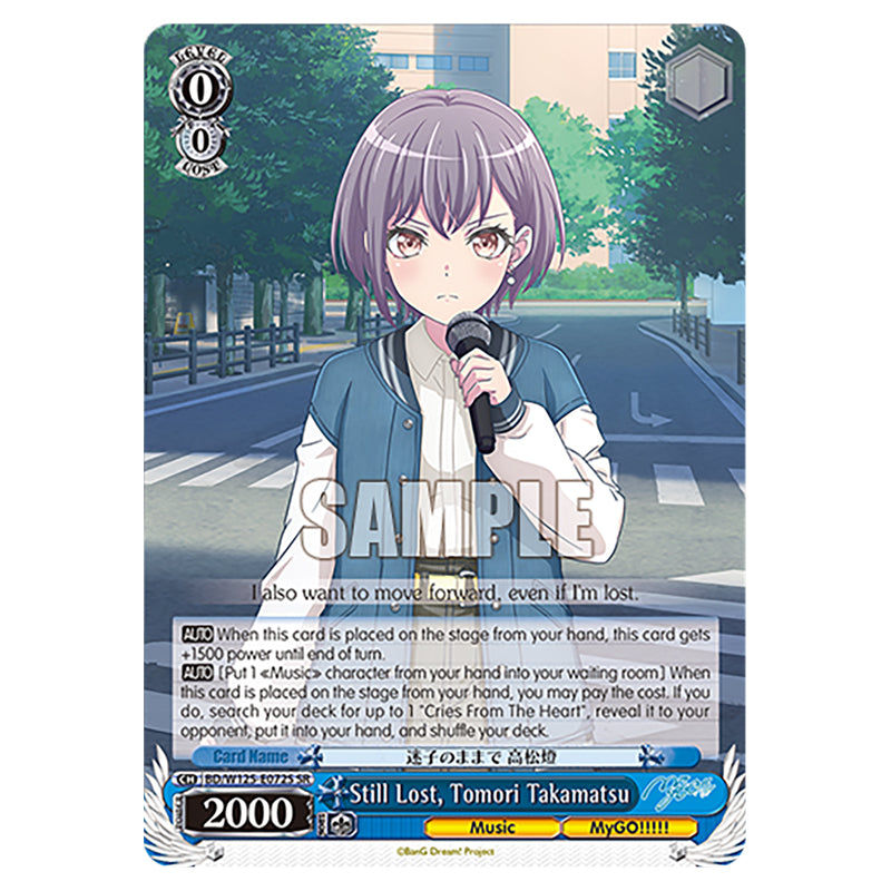 Still Lost, Tomori Takamatsu is a SR Blue Character card from the Weiss Schwarz set MyGO!!!!! × Ave Mujica (WSSC-BD/W125-E072S) 【AUTO】 When this card is placed on the stage from your hand, this card gets +1500 power until end of turn. 【AUTO】 [Put 1 《Music》 character from your hand into your waiting room] When this card is placed on the stage from your hand, you may pay the cost. If you do, search your deck for up to 1 "Cries From The Heart", reveal it to your opponent, put it into your hand, and shuffle your deck.