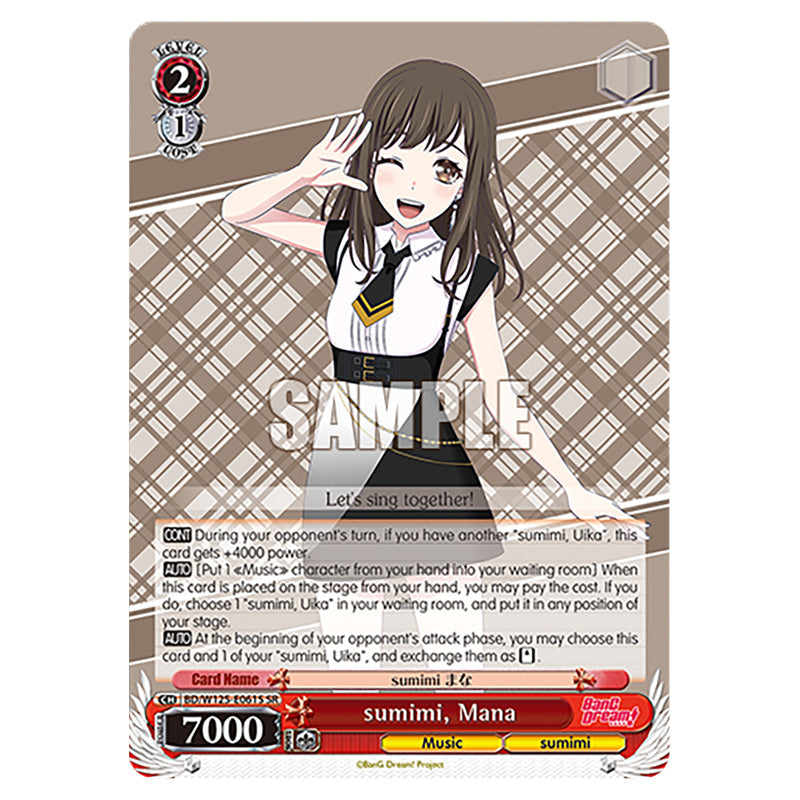 sumimi, Mana is a SR Red Character card from the Weiss Schwarz set MyGO!!!!! × Ave Mujica (WSSC-BD/W125-E061S) 【CONT】 During your opponent's turn, if you have another "sumimi, Uika", this card gets +4000 power. 【AUTO】 [Put 1 《Music》 character from your hand into your waiting room] When this card is placed on the stage from your hand, you may pay the cost. If you do, choose 1 "sumimi, Uika" in your waiting room, and put it in any position of your stage. 【AUTO】 At the beginning of your opponent's attack phase, you may choose this card and 1 of your "sumimi, Uika", and exchange them as 【STAND】.