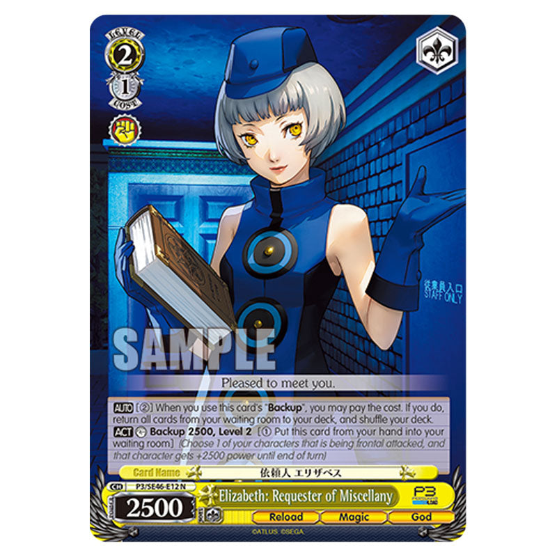 Elizabeth: Requester of Miscellany is a N Yellow Character card from the Weiss Schwarz set Persona 3 Reload (WSSC-P3/SE46-E12) [AUTO] [(2)] When you use this card's "Backup", you may pay the cost. If you do, return all cards from your waiting room to your deck, and shuffle your deck. [ACT] [COUNTER] Backup 2500, Level 2 [(1) Put this card from your hand into your waiting room] (Choose 1 of your characters that is being frontal attacked, and that character gets +2500 power until end of turn)