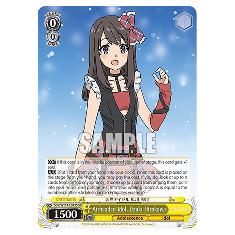 Airheaded Idol, Uzuki Hirokawa is a SR Yellow Character card from the Weiss Schwarz set Rascal Does Not Dream of a Sister Venturing Out & Knapsack Kid (WSSC-SBY/W114-E013S)