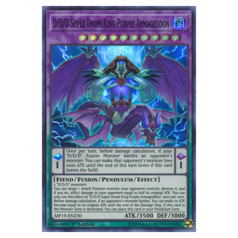 [ Pendulum Effect ] Once per turn, before damage calculation, if your "D/D/D" Fusion Monster battles an opponent's monster: You can make that opponent's monster lose 1000 ATK until the end of this turn (even if this card leaves the field). [ Monster Effect ] 2 "D/D/D" monsters You can target 1 Attack Position monster your opponent controls; destroy it, and if you do, inflict damage to your opponent equal to half its original ATK. You can only use this effect of "D/D/D Super Doom King Purple Armageddon" once per turn. Before damage calculation, if an opponent's monster battles: You can make its ATK become equal to its original ATK until the end of the Damage Step. If this card in the Monster Zone is destroyed: You can place this card in your Pendulum Zone.