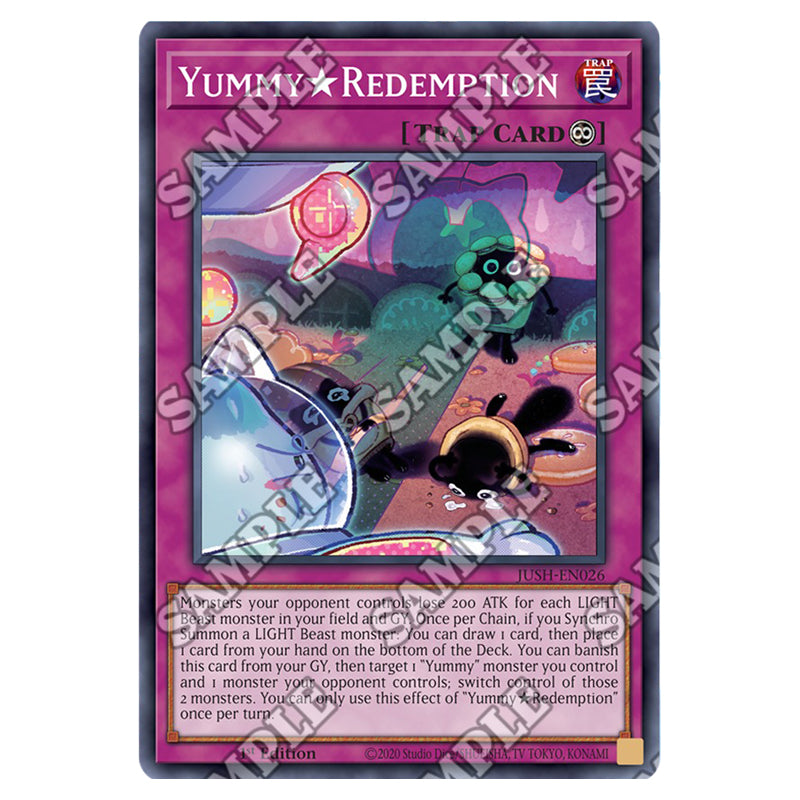 Yummy★Redemption is a Super Rare, Continuous Trap from the Yugioh set Justice Hunters (JUSH-EN026a)