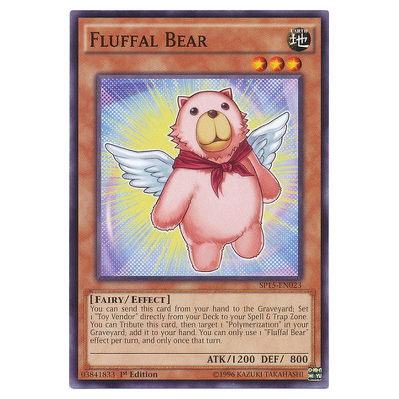 You can send this card from your hand to the Graveyard; Set 1 \\"Toy Vendor\\" directly from your Deck to your Spell & Trap Zone. You can Tribute this card, then target 1 \\"Polymerization\\" in your Graveyard; add it to your hand. You can only use 1 \\"Fluffal Bear\\" effect per turn, and only once that turn.