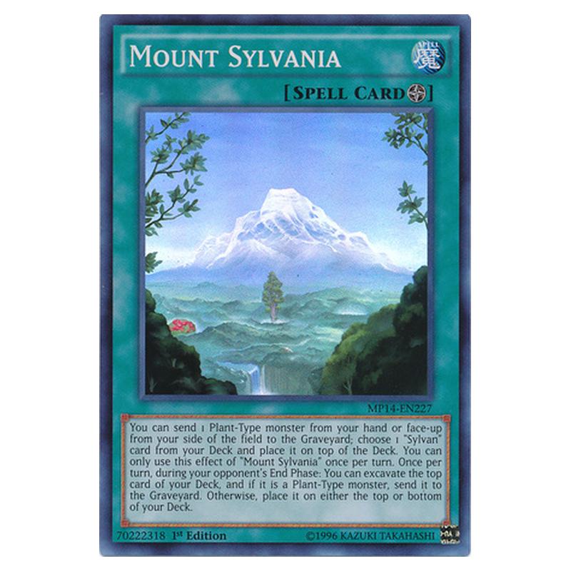 You can send 1 Plant-Type monster from your hand or face-up from your side of the field to the Graveyard; choose 1 "Sylvan" card from your Deck and place it on top of the Deck. You can only use this effect of "Mount Sylvania" once per turn. Once per turn, during your opponent's End Phase: You can excavate the top card of your Deck, and if it is a Plant-Type monster, send it to the Graveyard. Otherwise, place it on either the top or bottom of your Deck.