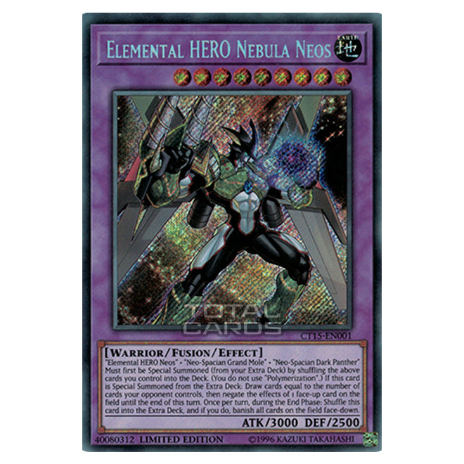 Elemental HERO Nebula Neos is a Secret Rare, Effect Fusion Monster from the Yugioh set 2018 Mega-Tin Mega Pack (CT15-EN001)