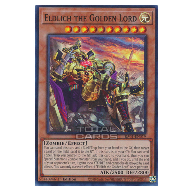 Eldlich the Golden Lord (alternate art) is a Super Rare, Effect Monster from the Yugioh set 25th Anniversary Rarity Collection (RA01-EN019A-SR)