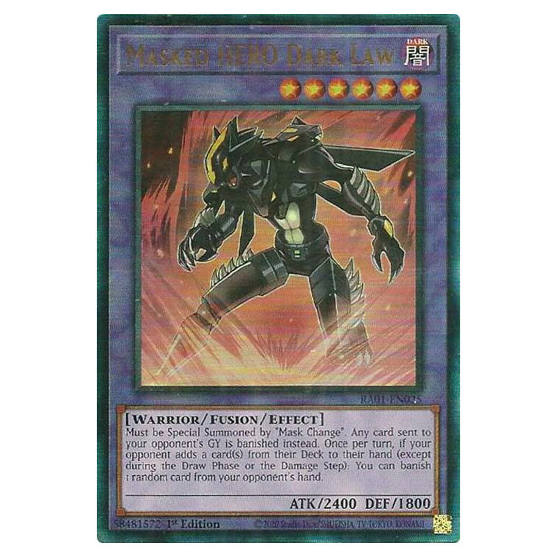 Masked HERO Dark Law is a Ultimate Rare, Effect Fusion Monster from the Yugioh set 25th Anniversary Rarity Collection (RA01-EN025-ULTIR)