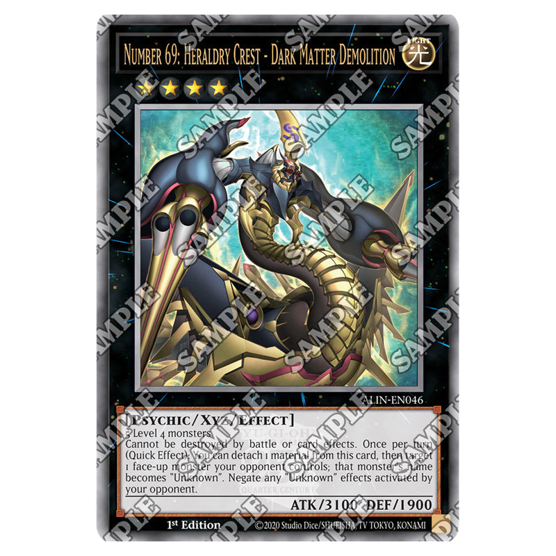 Number 69: Heraldry Crest - Dark Matter Demolition is a Quarter Century Secret Rare, Effect Xyz Monster from the Yugioh set Alliance Insight (ALIN-EN046-QCR)