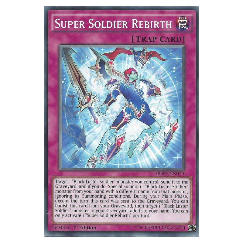 Target 1 "Black Luster Soldier" monster you control; send it to the Graveyard, and if you do, Special Summon 1 "Black Luster Soldier" monster from your hand with a different name from that monster, ignoring its Summoning conditions. During your Main Phase, except the turn this card was sent to the Graveyard: You can banish this card from your Graveyard, then target 1 "Black Luster Soldier" monster in your Graveyard; add it to your hand. You can only activate 1 "Super Soldier Rebirth" per turn.