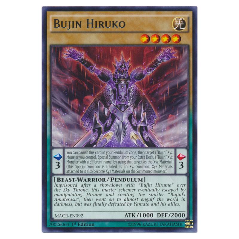 [ Pendulum Effect ] You can banish this card in your Pendulum Zone, then target 1 "Bujin" Xyz Monster you control; Special Summon from your Extra Deck, 1 "Bujin" Xyz Monster with a different name, by using that target as the Xyz Material. (This Special Summon is treated as an Xyz Summon. Xyz Materials attached to it also become Xyz Materials on the Summoned monster.) [ Monster Effect ] ''Imprisoned after a showdown with "Bujin Hirume" over the Sky Throne, this master schemer eventually escaped by manipulating Hirume and creating the sinister "Bujinki Amaterasu", then went on to almost engulf the world in darkness, but was finally defeated by Yamato and his allies.''