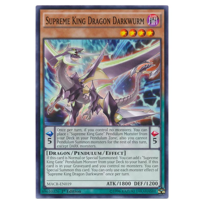 [ Pendulum Effect ] Once per turn, if you control no monsters: You can place 1 "Supreme King Gate" Pendulum Monster from your Deck in your Pendulum Zone, also you cannot Pendulum Summon monsters for the rest of this turn, except DARK monsters. [ Monster Effect ] If this card is Normal or Special Summoned: You can add 1 "Supreme King Gate" Pendulum Monster from your Deck to your hand. If this card is in your GY and you control no monsters: You can Special Summon this card. You can only use each monster effect of "Supreme King Dragon Darkwurm" once per turn.