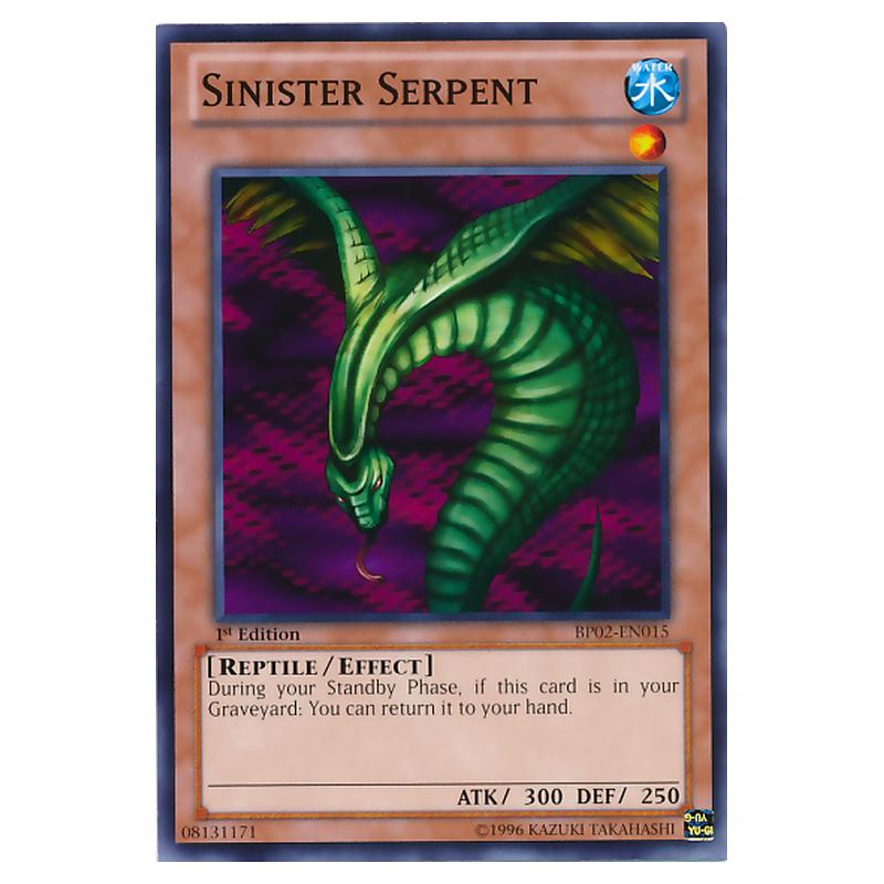 During your Standby Phase, if this card is in your GY: You can add it to your hand, also banish 1 "Sinister Serpent" from your GY during your opponent's next End Phase. You can only use this effect of "Sinister Serpent" once per turn.