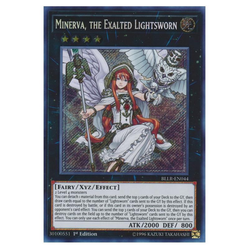 2 Level 4 monsters You can detach 1 material from this card; send the top 3 cards of your Deck to the GY, then draw cards equal to the number of "Lightsworn" cards sent to the GY by this effect. If this card is destroyed by battle, or if this card in its owner's possession is destroyed by an opponent's card effect: You can send the top 3 cards of your Deck to the GY, then you can destroy cards on the field up to the number of "Lightsworn" cards sent to the GY by this effect. You can only use each effect of "Minerva, the Exalted Lightsworn" once per turn.