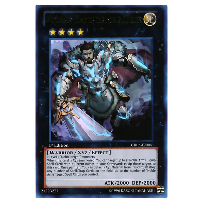 2 Level 4 \\"Noble Knight\\" monstersWhen this card is Xyz Summoned: You can target up to 3 \\"Noble Arms\\" Equip Spell Cards with different names in your Graveyard; equip those targets to this card. Once per turn: You can detach 1 Xyz Material from this card; destroy any number of Spell/Trap Cards on the field, up to the number of \\"Noble Arms\\" Equip Spell Cards you control.
