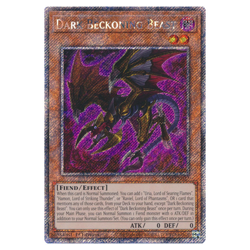 Dark Beckoning Beast is a Platinum Secret Rare, Effect Monster from the Yugioh set Quarter Century Bonanza (RA03-EN027)