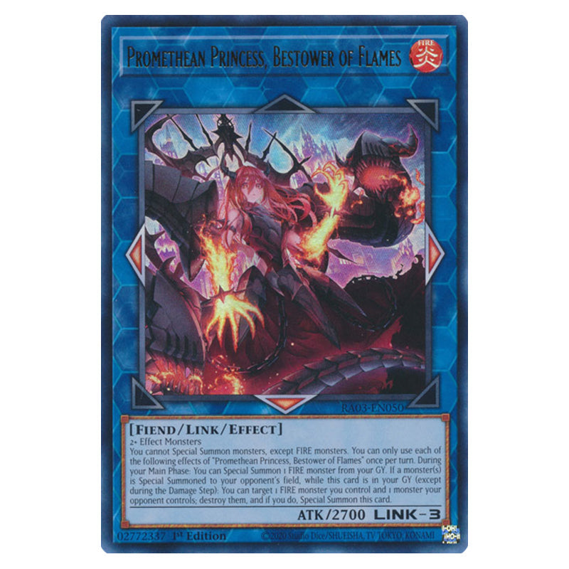 Promethean Princess, Bestower of Flames is a Ultra Rare, Effect Monster from the Yugioh set Quarter Century Bonanza (RA03-EN050)