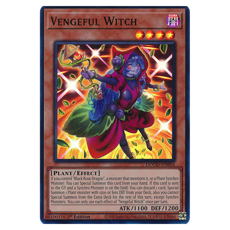 "Vengeful Witch" is a Super Rare, Effect Monster from the Yugioh set Doom of Dimensions (DOOD-EN004)