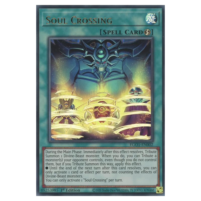 During the Main Phase: Immediately after this effect resolves, Tribute Summon 1 Divine-Beast monster. When you do, you can Tribute a monster(s) your opponent controls, even though you do not control them, but if you Tribute Summon this way, apply this effect. ● Until the end of the next turn after this card resolves, you can only activate 1 card or effect per turn, not counting the effects of Divine-Beast monsters. You can only activate 1 "Soul Crossing" per turn.