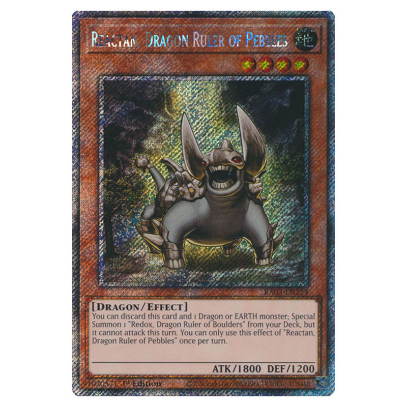 Reactan, Dragon Ruler of Pebbles is a Platinum Secret Rare, Effect Monster from the Yugioh set Quarter Century Bonanza (RA03-EN254)