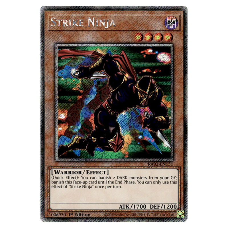 Strike Ninja is a Platinum Secret Rare, Effect Monster from the Yugioh set Quarter Century Bonanza (RA03-EN131)