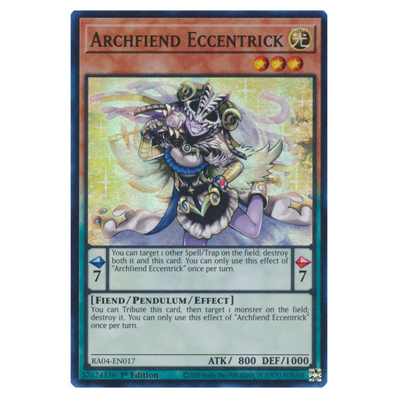 Archfiend Eccentrick is a Super Rare, Effect Pendulum Monster from the Yugioh set Quarter Century Stampede (RA04-EN017-SR)