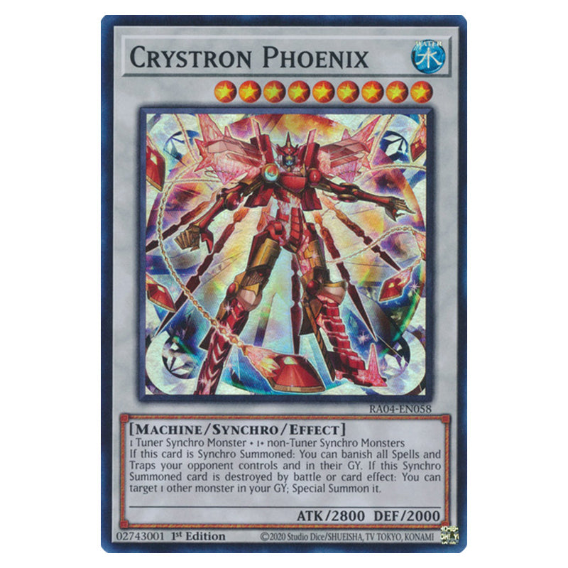 Crystron Phoenix is a Super Rare, Effect Synchro Monster from the Yugioh set Quarter Century Stampede (RA04-EN058-SR)