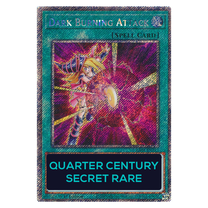 Dark Burning Attack is a Quarter Century Secret Rare, Normal Spell from the Yugioh set Quarter Century Stampede (RA04-EN245-QCSR)