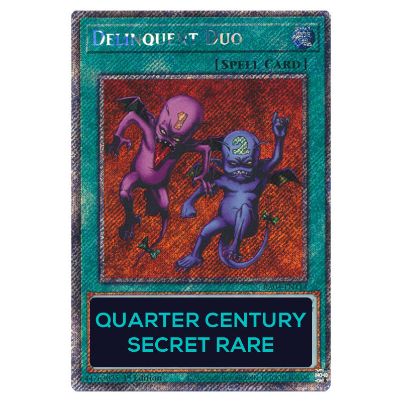 Delinquent Duo is a Quarter Century Secret Rare, Normal Spell from the Yugioh set Quarter Century Stampede (RA04-EN114-QCSR)