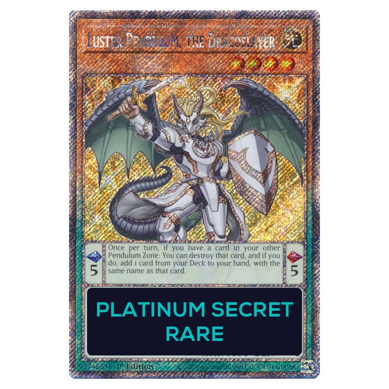 Luster Pendulum, the Dracoslayer is a Platinum Secret Rare, Effect Tuner Pendulum Monster from the Yugioh set Quarter Century Stampede (RA04-EN252-PSR)
