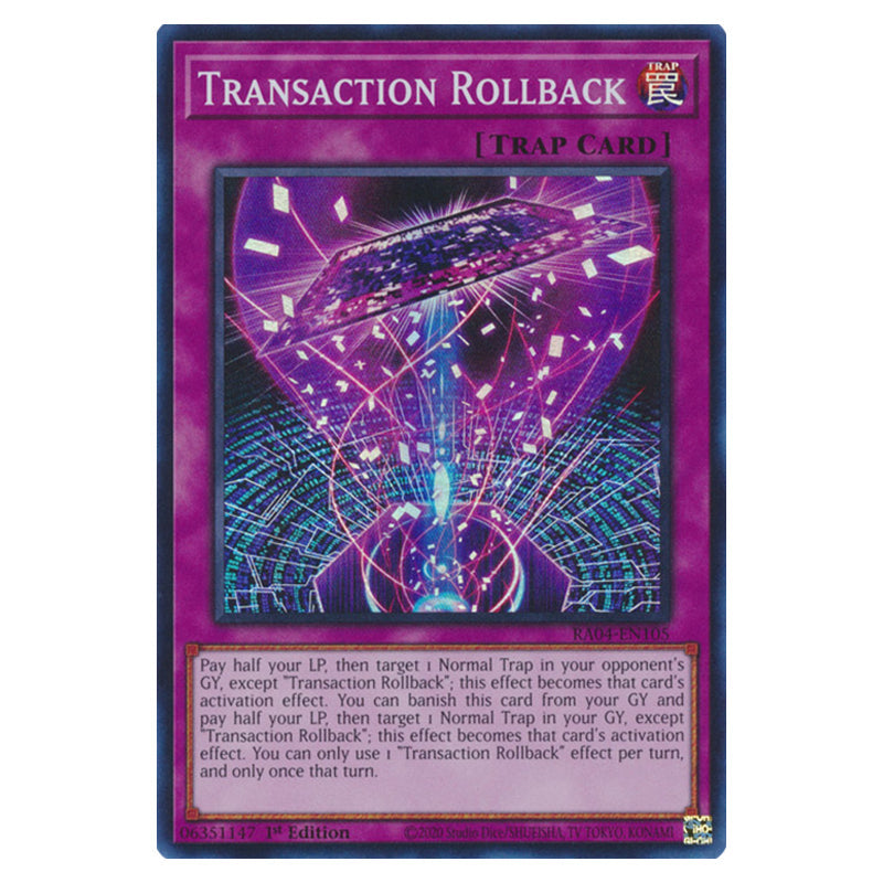 Transaction Rollback is a Super Rare, Normal Trap from the Yugioh set Quarter Century Stampede (RA04-EN105-SR)