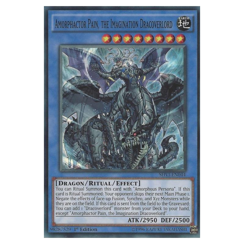 You can Ritual Summon this card with "Amorphous Persona". If this card is Ritual Summoned: Your opponent skips their next Main Phase 1. Negate the effects of face-up Fusion, Synchro, and Xyz Monsters while they are on the field. If this card is sent from the field to the Graveyard: You can add 1 "Dracoverlord" monster from your Deck to your hand, except "Amorphactor Pain, the Imagination Dracoverlord".
