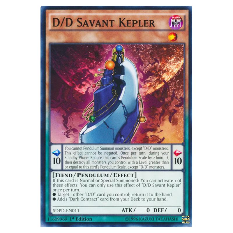[ Pendulum Effect ] You cannot Pendulum Summon monsters, except "D/D" monsters. This effect cannot be negated. Once per turn, during your Standby Phase: Reduce this card's Pendulum Scale by 2 (min. 1), then destroy all monsters you control with a Level greater than or equal to this card's Pendulum Scale, except "D/D" monsters. [ Monster Effect ] If this card is Normal or Special Summoned: You can activate 1 of these effects. You can only use this effect of "D/D Savant Kepler" once per turn. ● Target 1 other "D/D" card you control; return it to the hand. ● Add 1 "Dark Contract" card from your Deck to your hand.