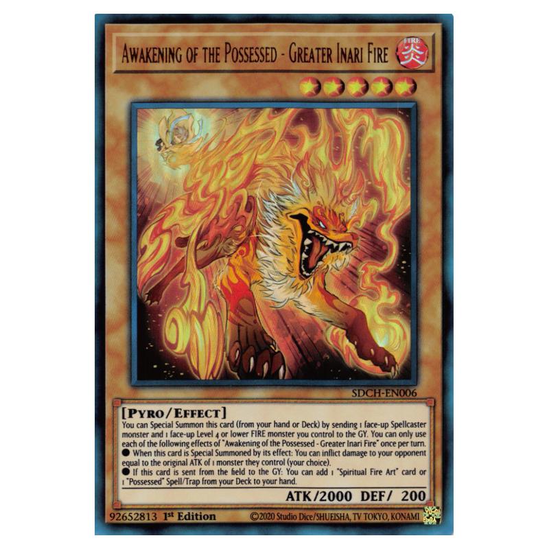 You can Special Summon this card (from your hand or Deck) by sending 1 face-up Spellcaster monster and 1 face-up Level 4 or lower FIRE monster you control to the GY. You can only use each of the following effects of "Awakening of the Possessed - Greater Inari Fire" once per turn. ● When this card is Special Summoned by its effect: You can inflict damage to your opponent equal to the original ATK of 1 monster they control (your choice). ● If this card is sent from the field to the GY: You can add 1 "Spiritual Fire Art" card or 1 "Possessed" Spell/Trap from your Deck to your hand.
