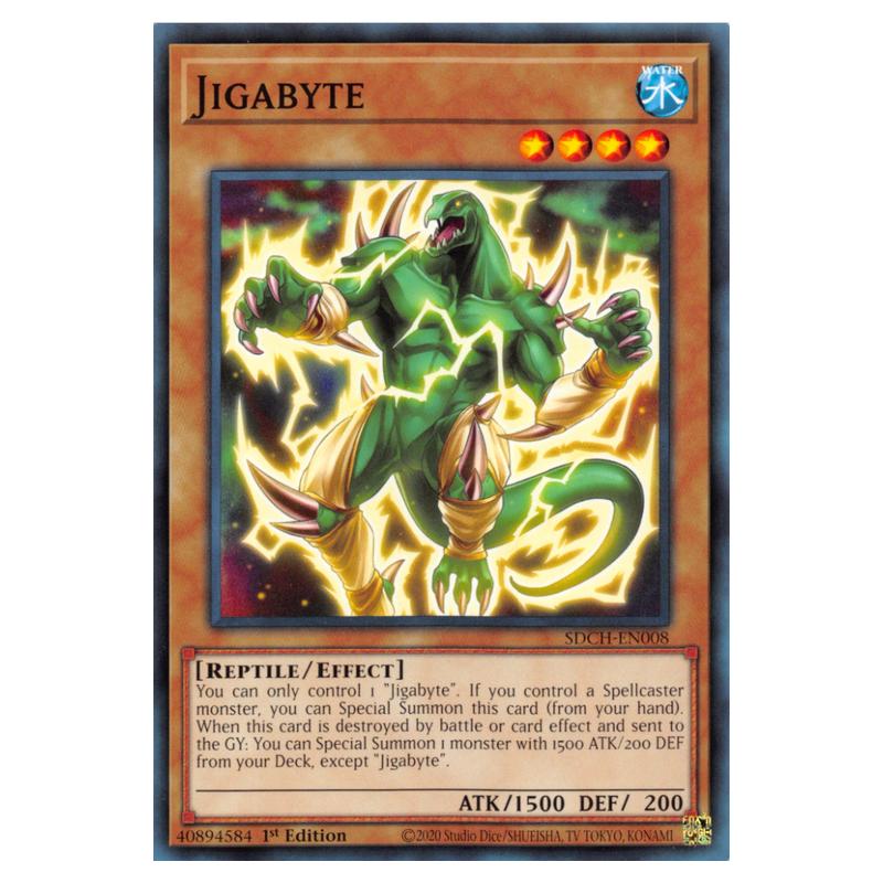 You can only control 1 "Jigabyte". If you control a Spellcaster-Type monster, you can Special Summon this card (from your hand). When this card is destroyed by battle or card effect and sent to the Graveyard: You can Special Summon 1 monster with 1500 ATK and 200 DEF from your Deck, except "Jigabyte".