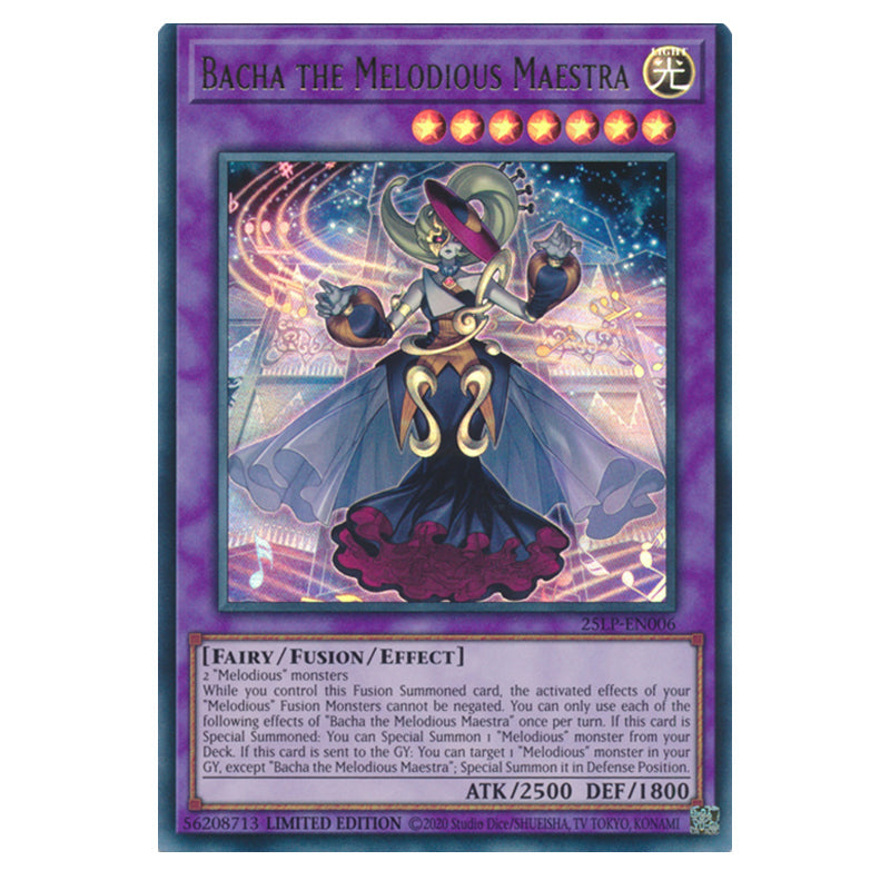 Bacha the Melodious Maestra is a Ultra Rare, Effect Fusion Monster from the Yugioh set World Championship 2025 - Limited Pack (25LP-EN006a)