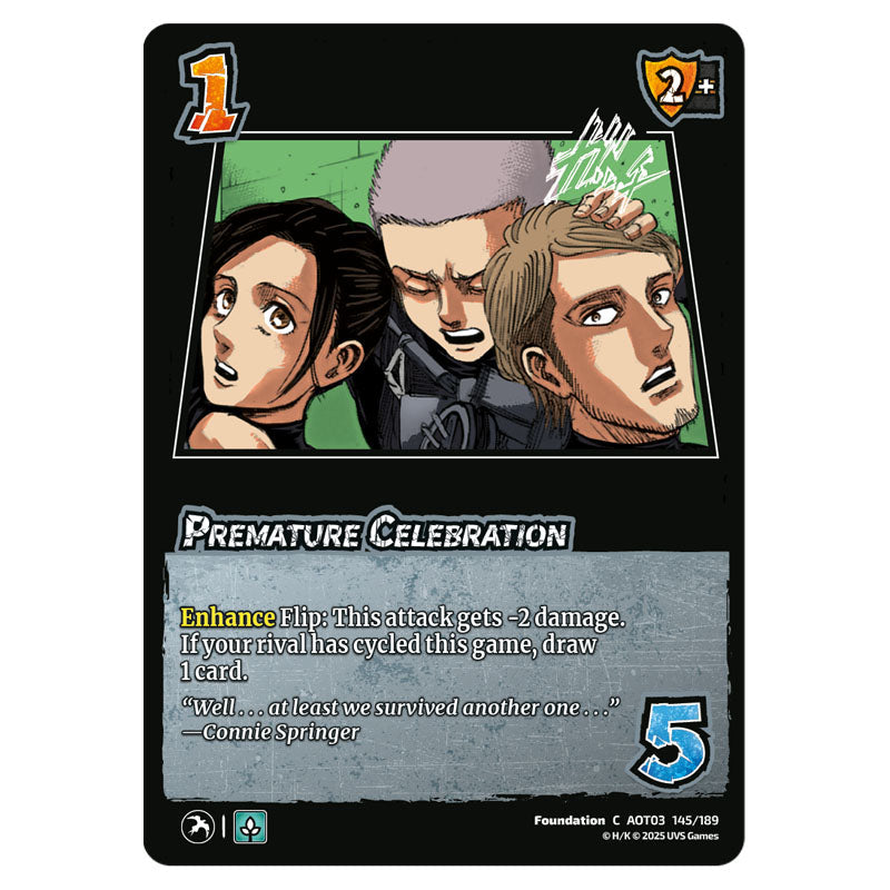 Premature Celebration is a Normal card from the Attack on Titan set Apocalypse C 03 145/189