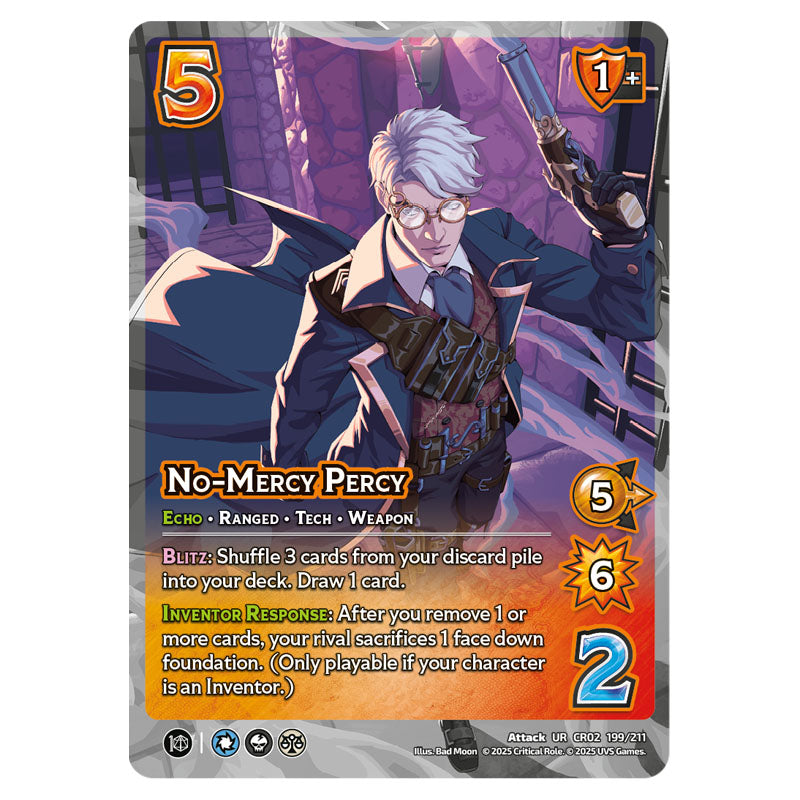 No-Mercy Percy is a UltraRare Attack card from the Universus set Crtical Role - Heroes of Exandria