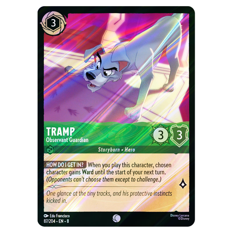 Tramp - Observant Guardian is a Common Foil Emerald card from the Lorcana set Reign of Jafar