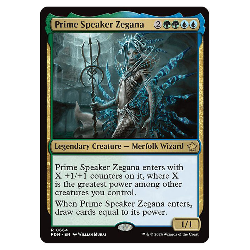 Prime Speaker Zegana is a Rare, Legendary Creature - Merfolk Wizard card from the Magic The Gathering set Foundations (MTGSC-FDN-0664)