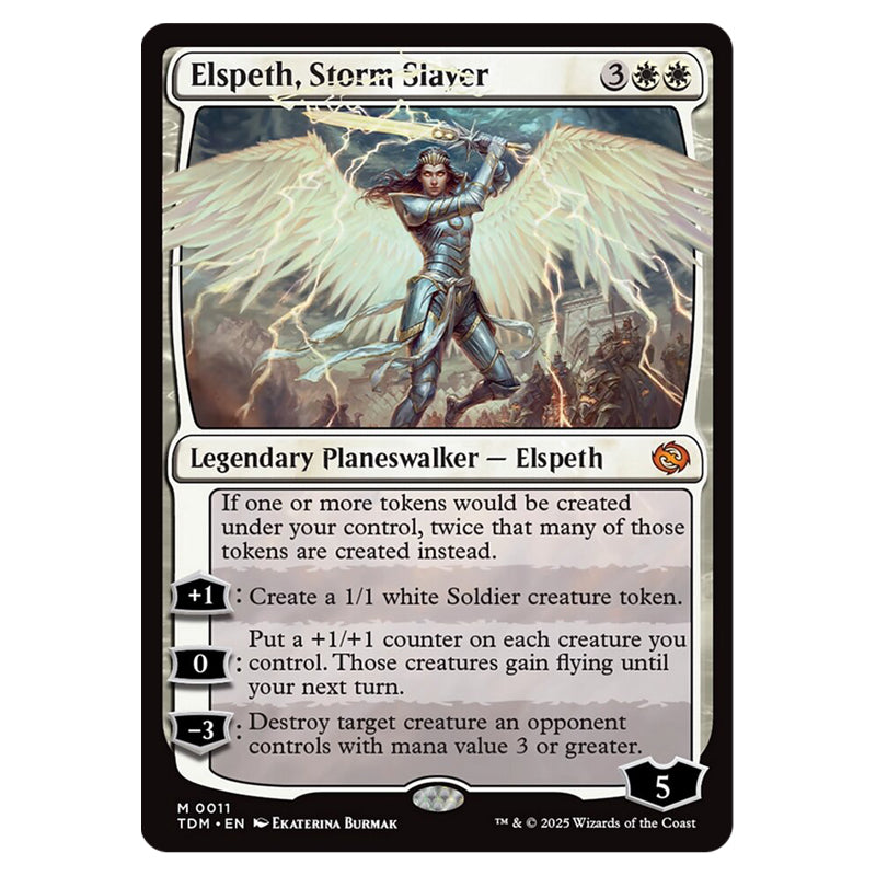 Elspeth, Storm Slayer is a Mythic, Legendary Planeswalker - Elspeth card from the Magic The Gathering set Tarkir: Dragonstorm (MTGSC-TDM-0011)