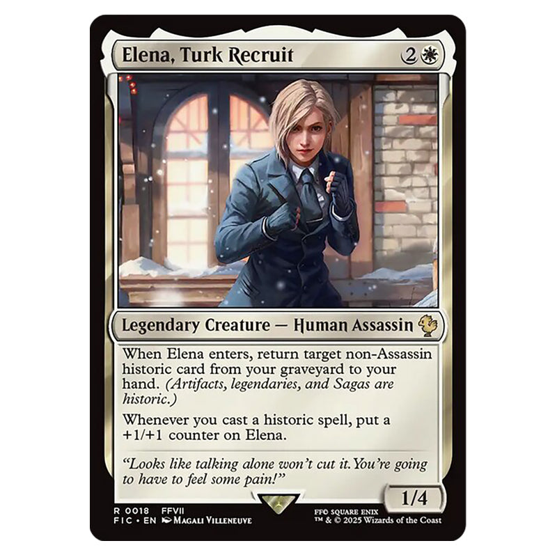 Elena, Turk Recruit is a Rare, Legendary Creature - Human Assassin card from the Magic The Gathering set Universes Beyond - Final Fantasy - Commander (MTGSC-FIC-0018)