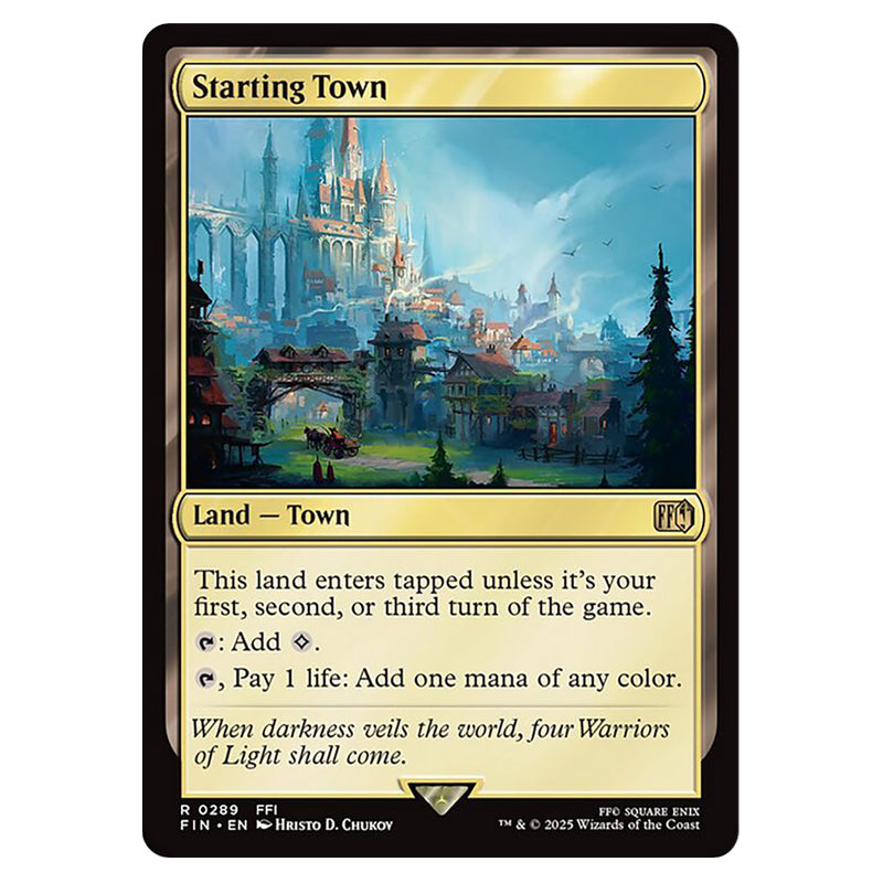 Starting Town is a Rare, Land - Town card from the Magic The Gathering set Universes Beyond - Final Fantasy (MTGSC-FIN-0289)