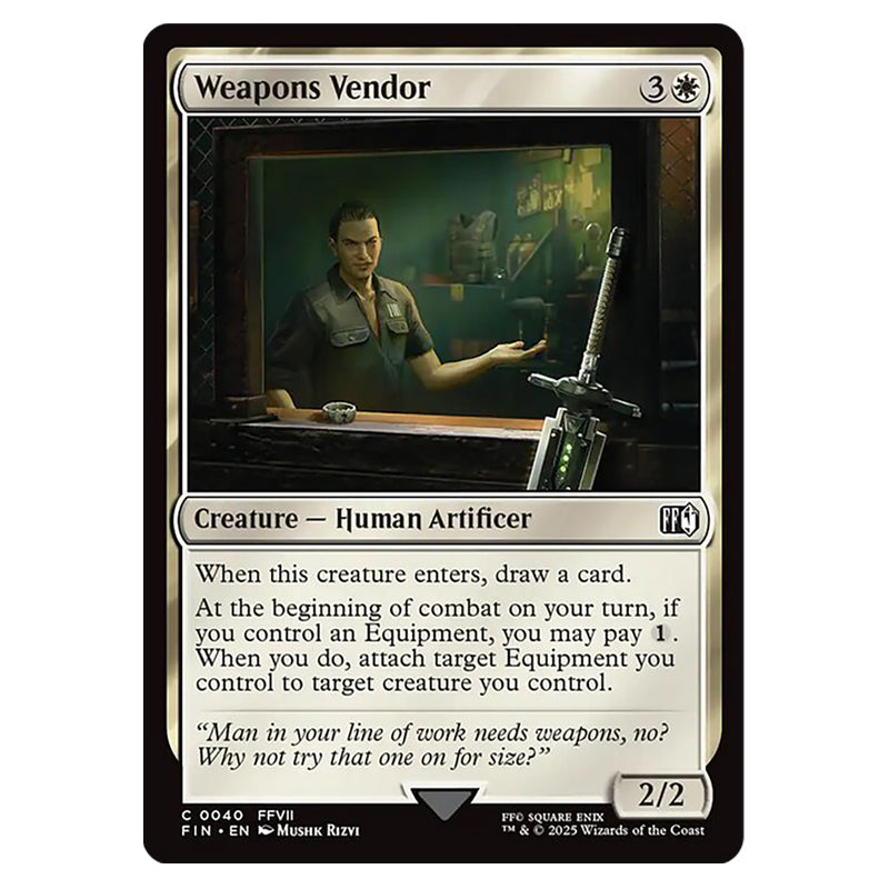 Weapons Vendor is a Common, Creature - Human Artificer card from the Magic The Gathering set Universes Beyond - Final Fantasy (MTGSC-FIN-0040)