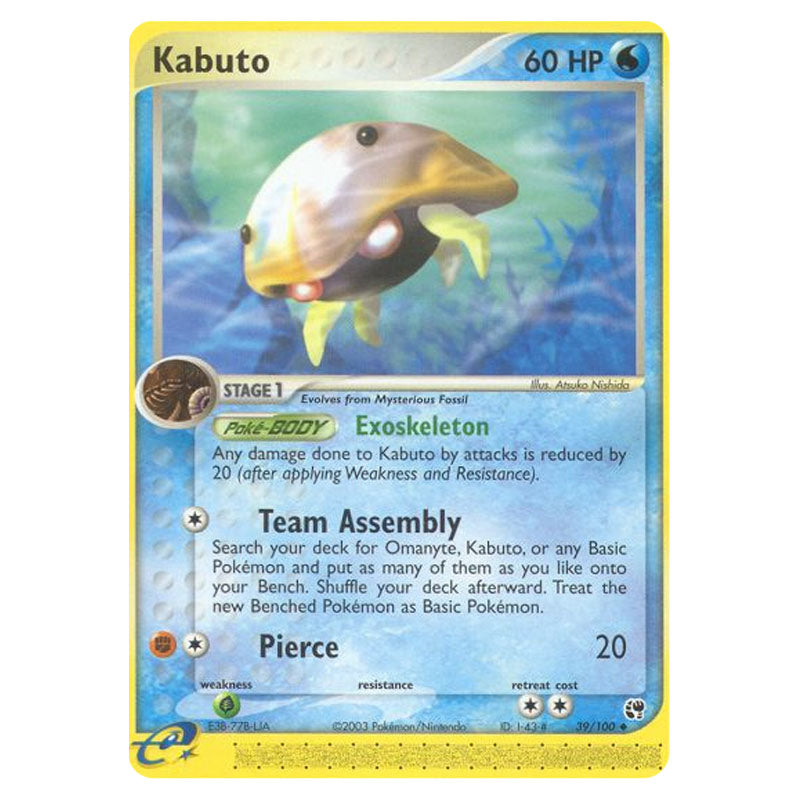 Kabuto is a Uncommon (Stage 1) Water type Pokémon card from EX2 - Sandstorm (039/100)