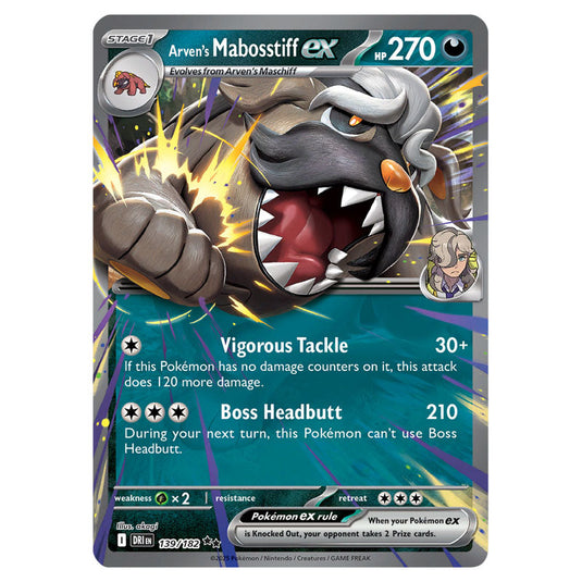 Arven's Mabosstiff ex is a Double Rare (Stage 1,ex) Darkness type Pokémon card from SV10 - Destined Rivals (139/182)