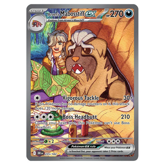 Arven's Mabosstiff ex is a Special Illustration Rare (Stage 1,ex) Darkness type Pokémon card from SV10 - Destined Rivals (235/182)