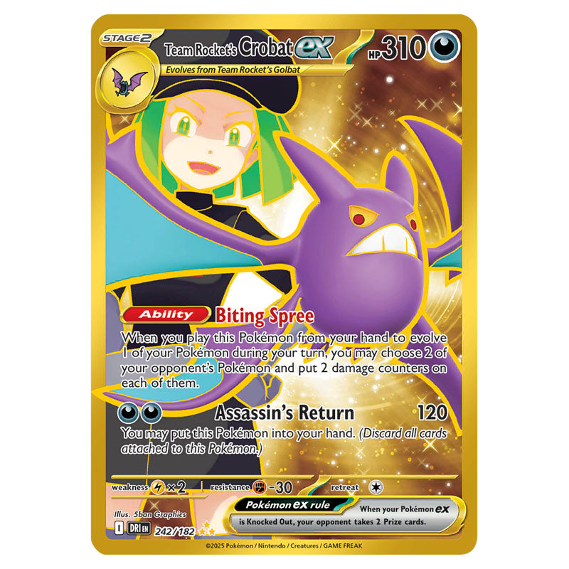 Team Rocket's Crobat ex is a Hyper Rare (Stage 2,ex) Darkness type Pokémon card from SV10 - Destined Rivals (242/182)