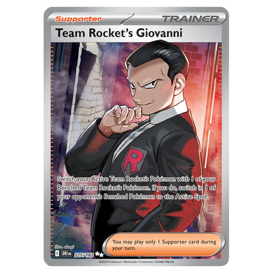 Team Rocket's Giovanni is a Ultra Rare (Supporter) type Trainer card from SV10 - Destined Rivals (225/182)